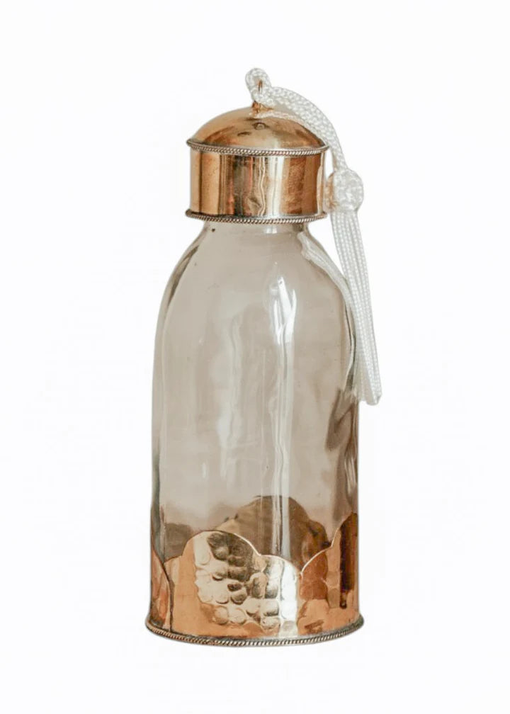 Handgemaakt flesje gemaakt van gerecycleerd glas en afgewerkt met prachtige messing details. .