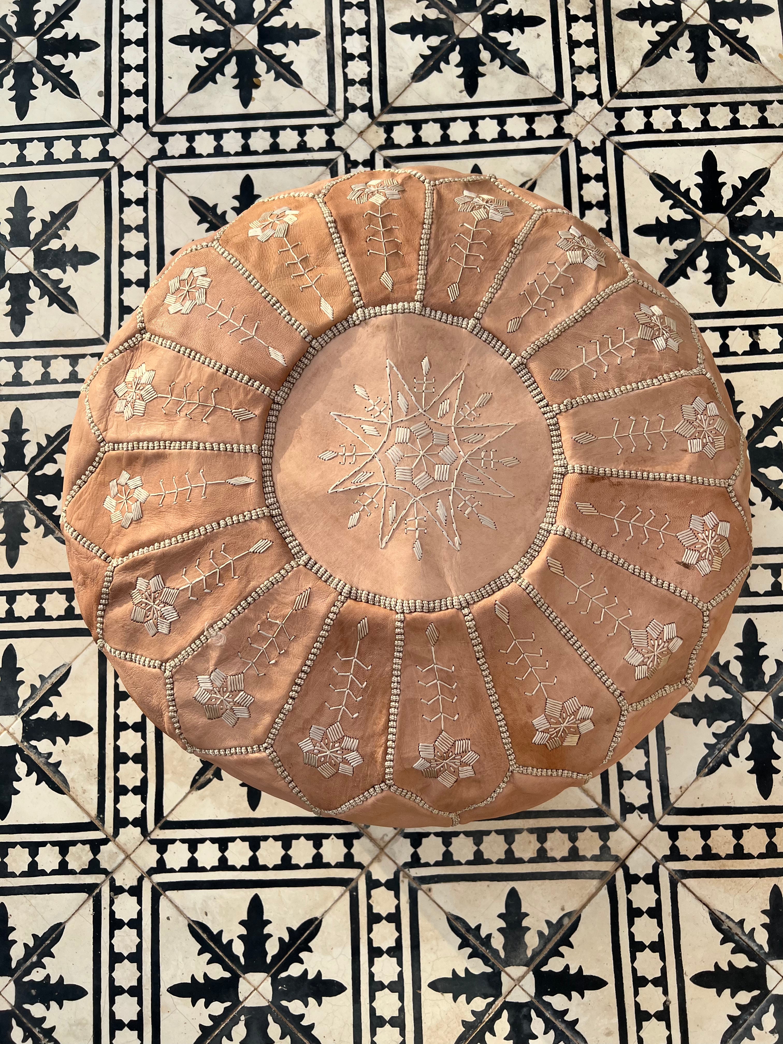 Marokkaanse leren poef large- cognac/nude bewerkt