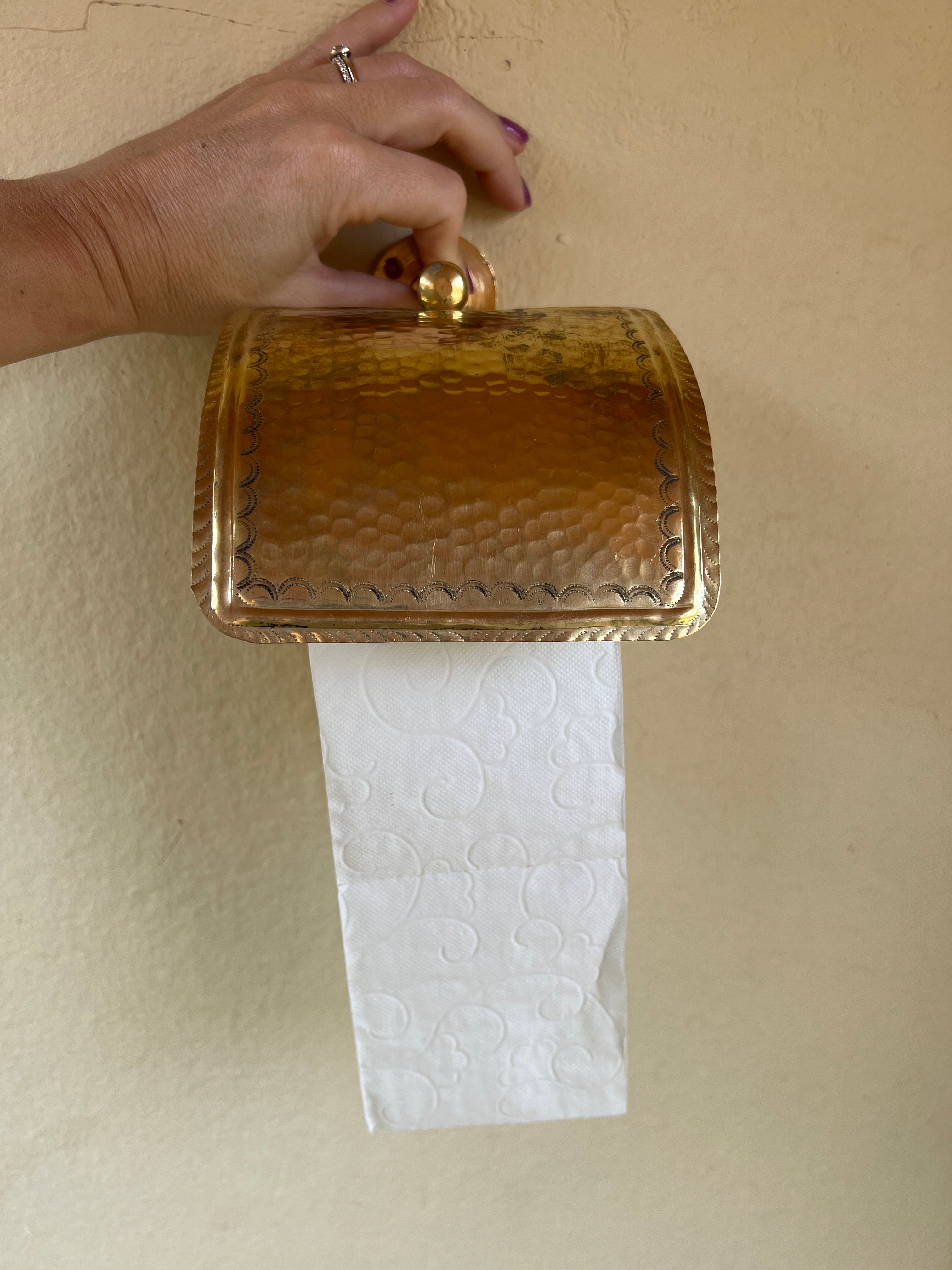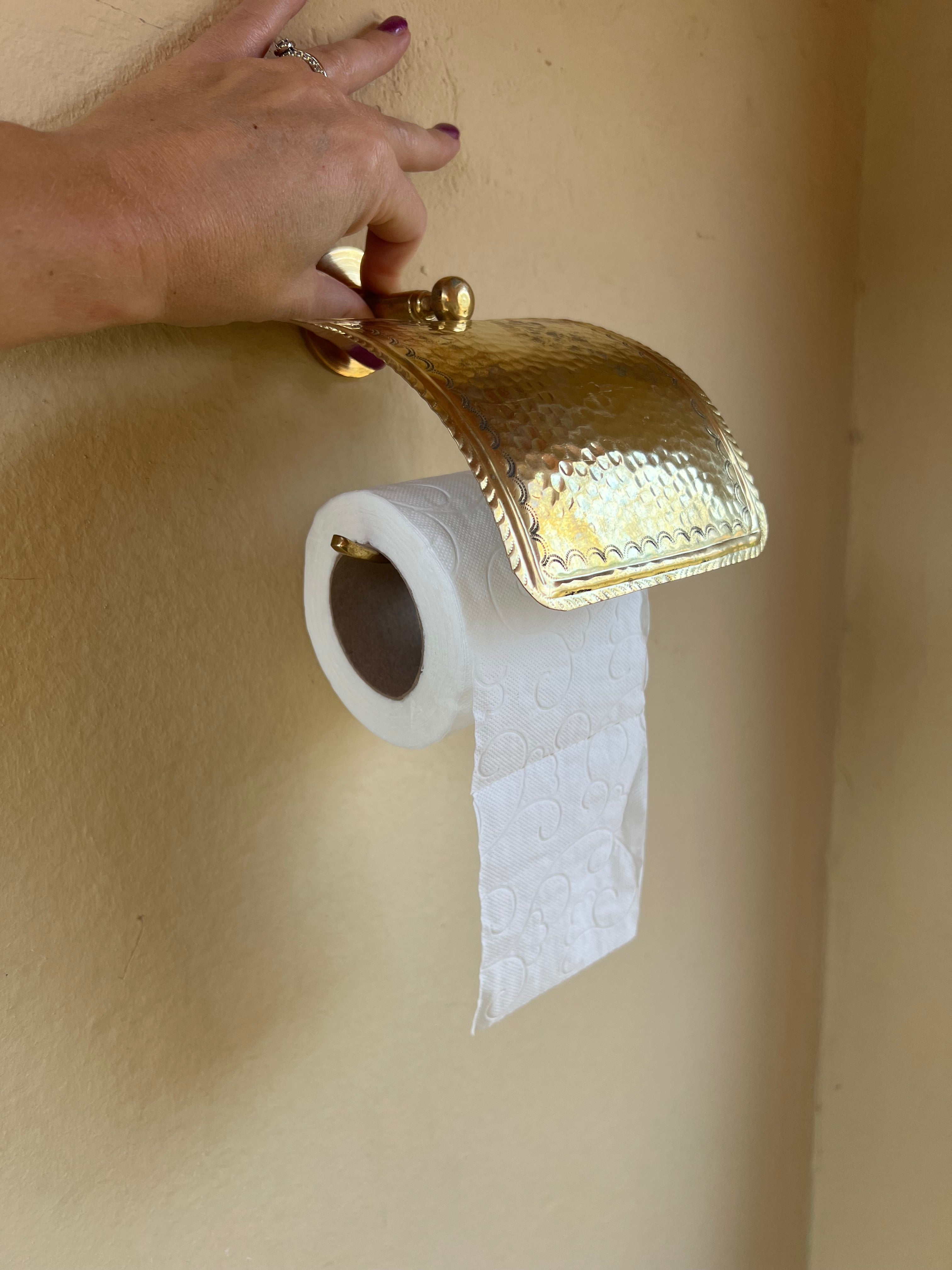 Deze messing toiletrolhouder is met de hand gehamerd en heeft daarom een mooi patroon.