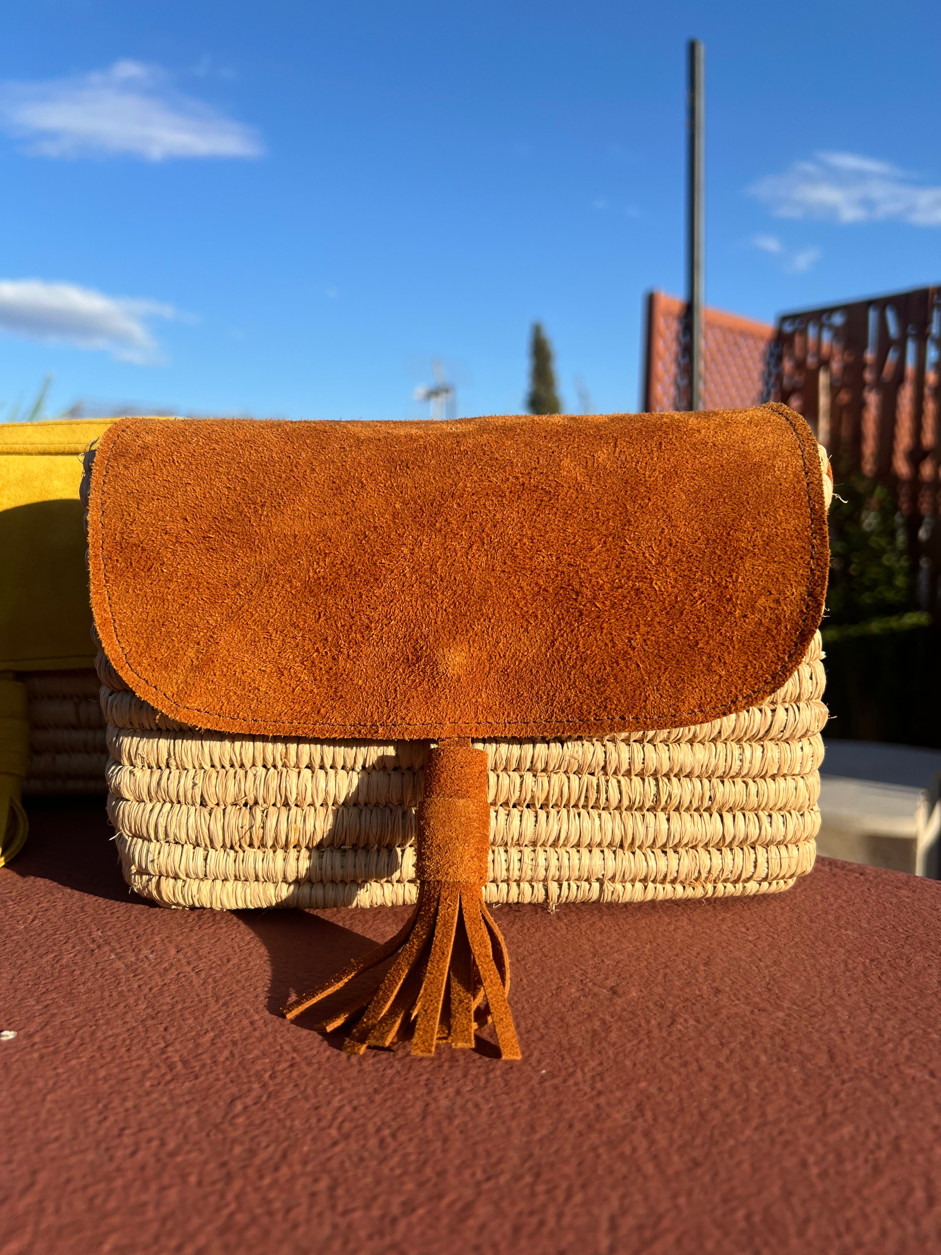 Raffia / suède schoudertas - bruin