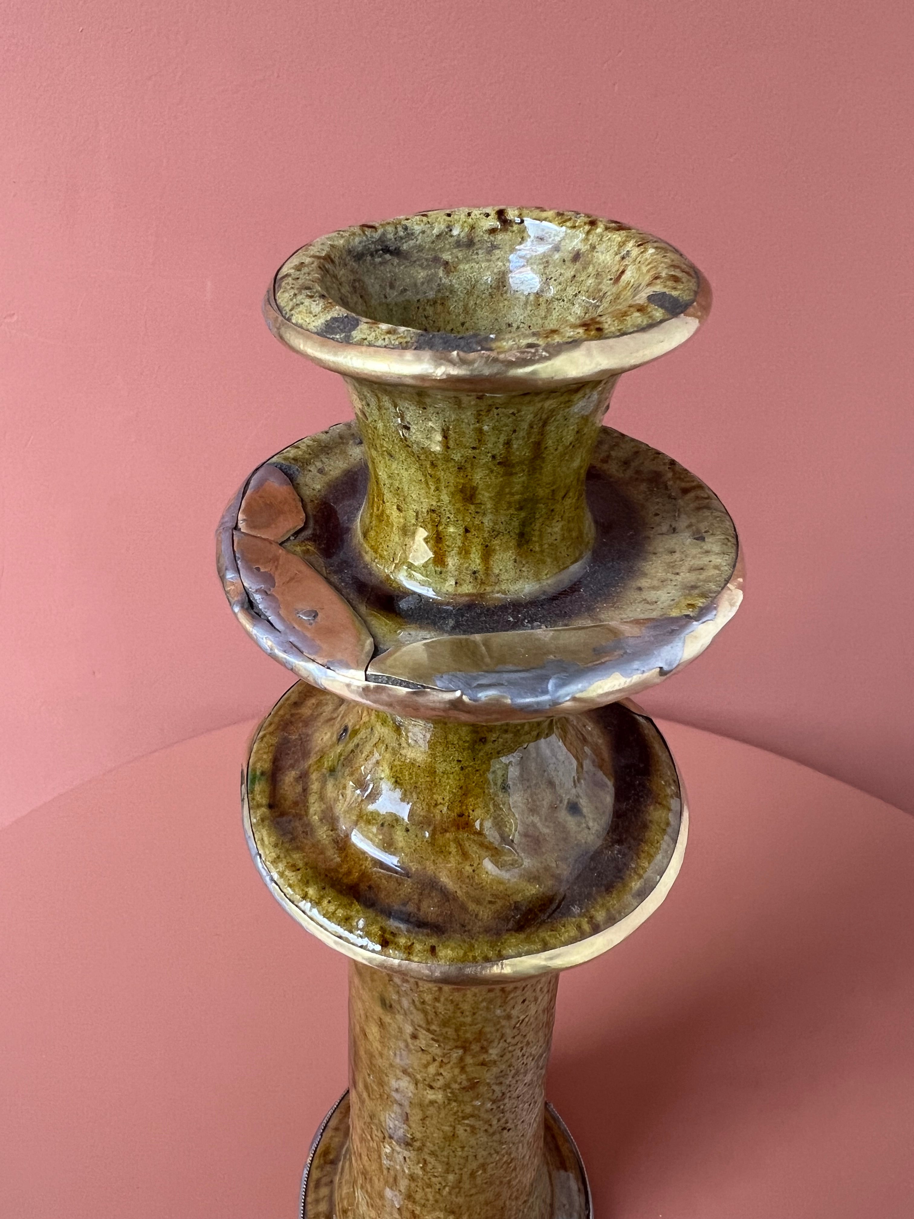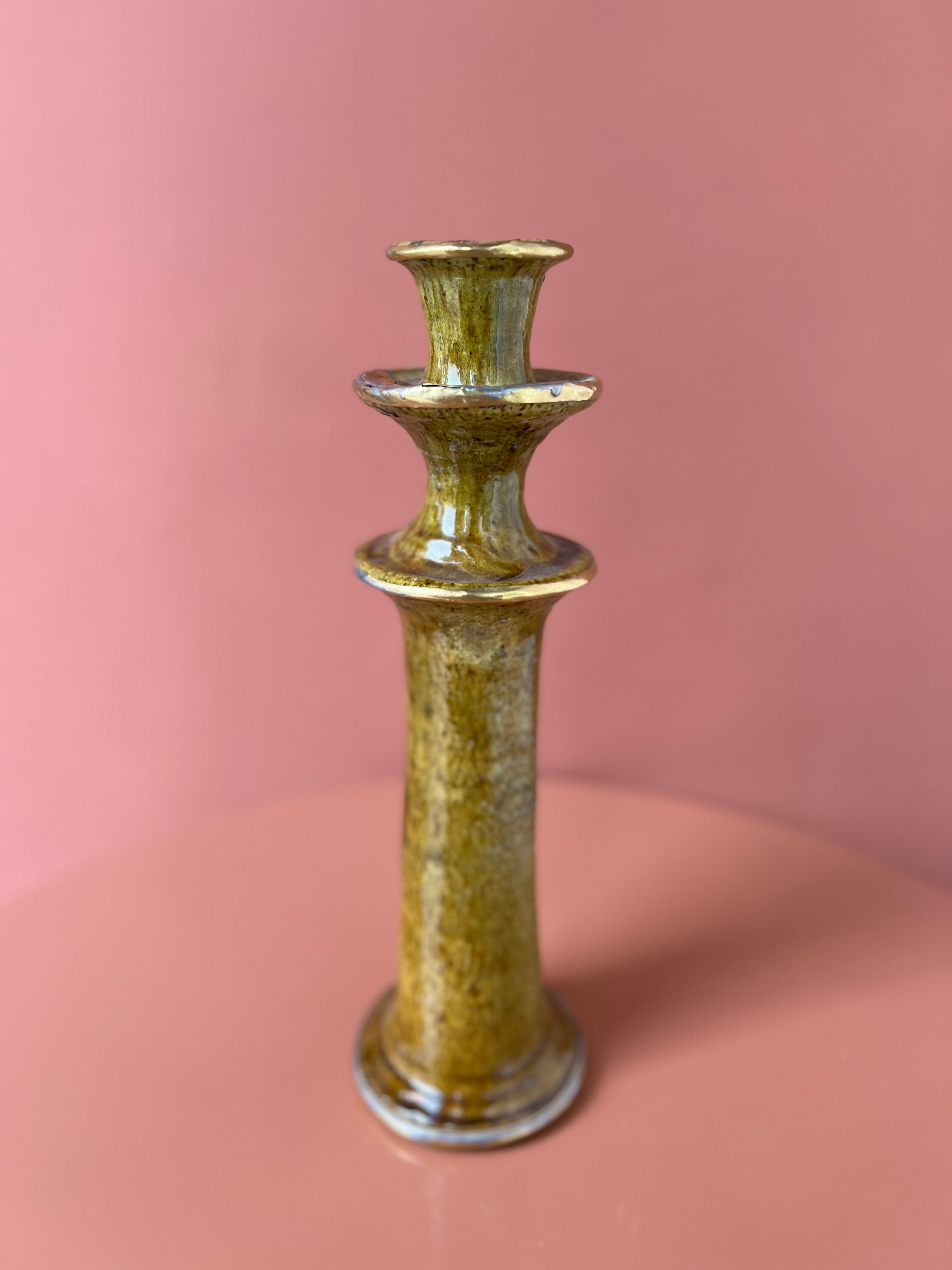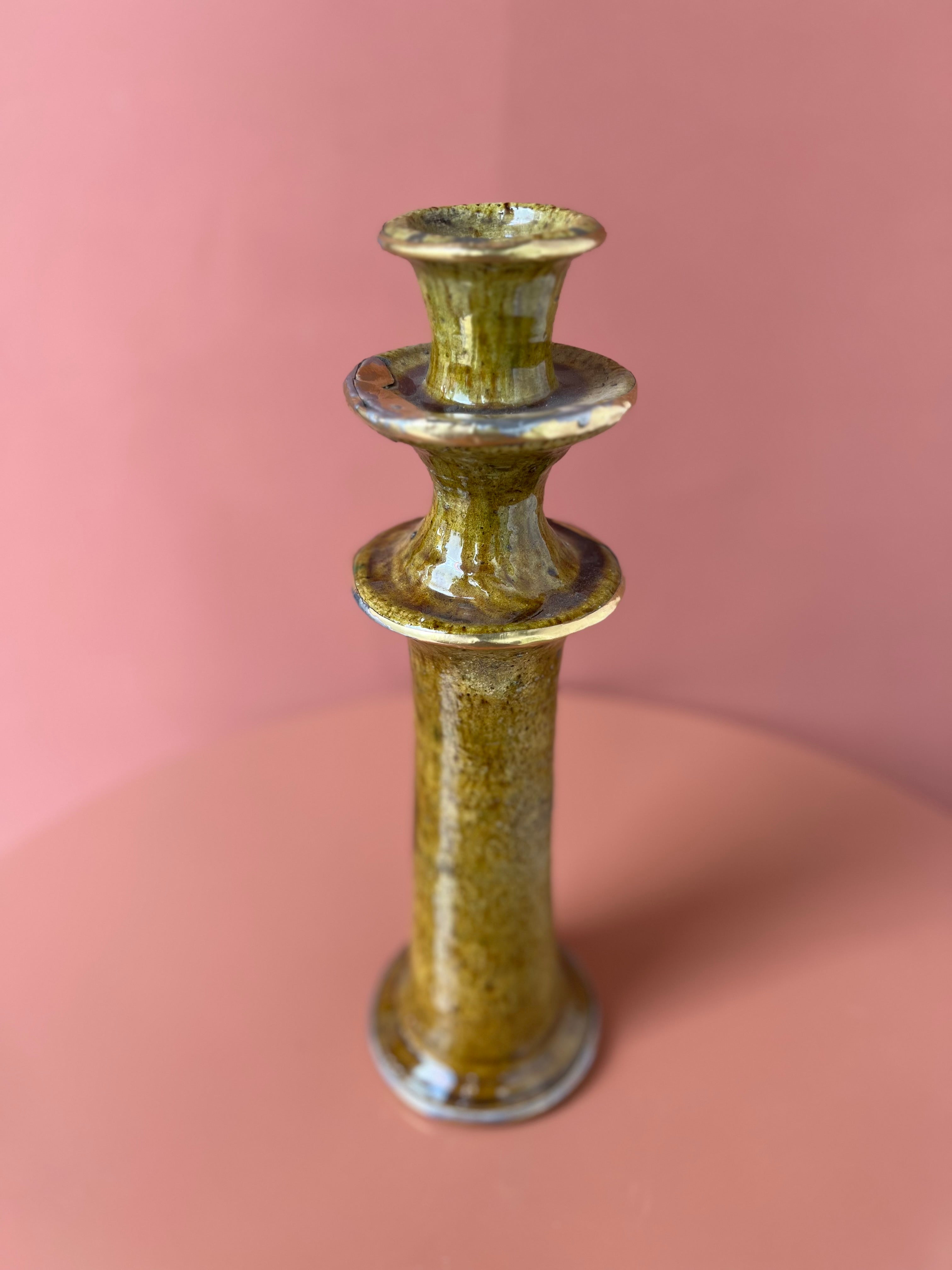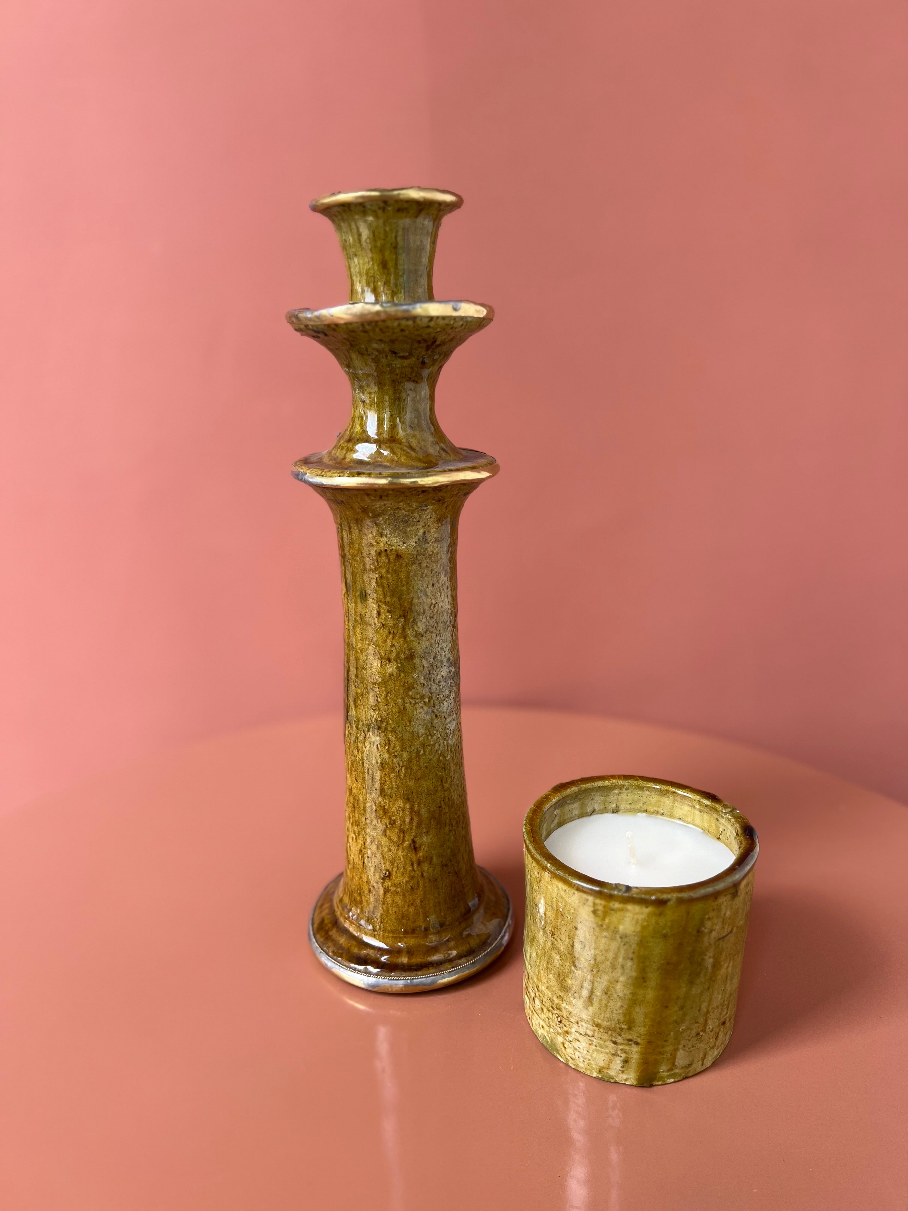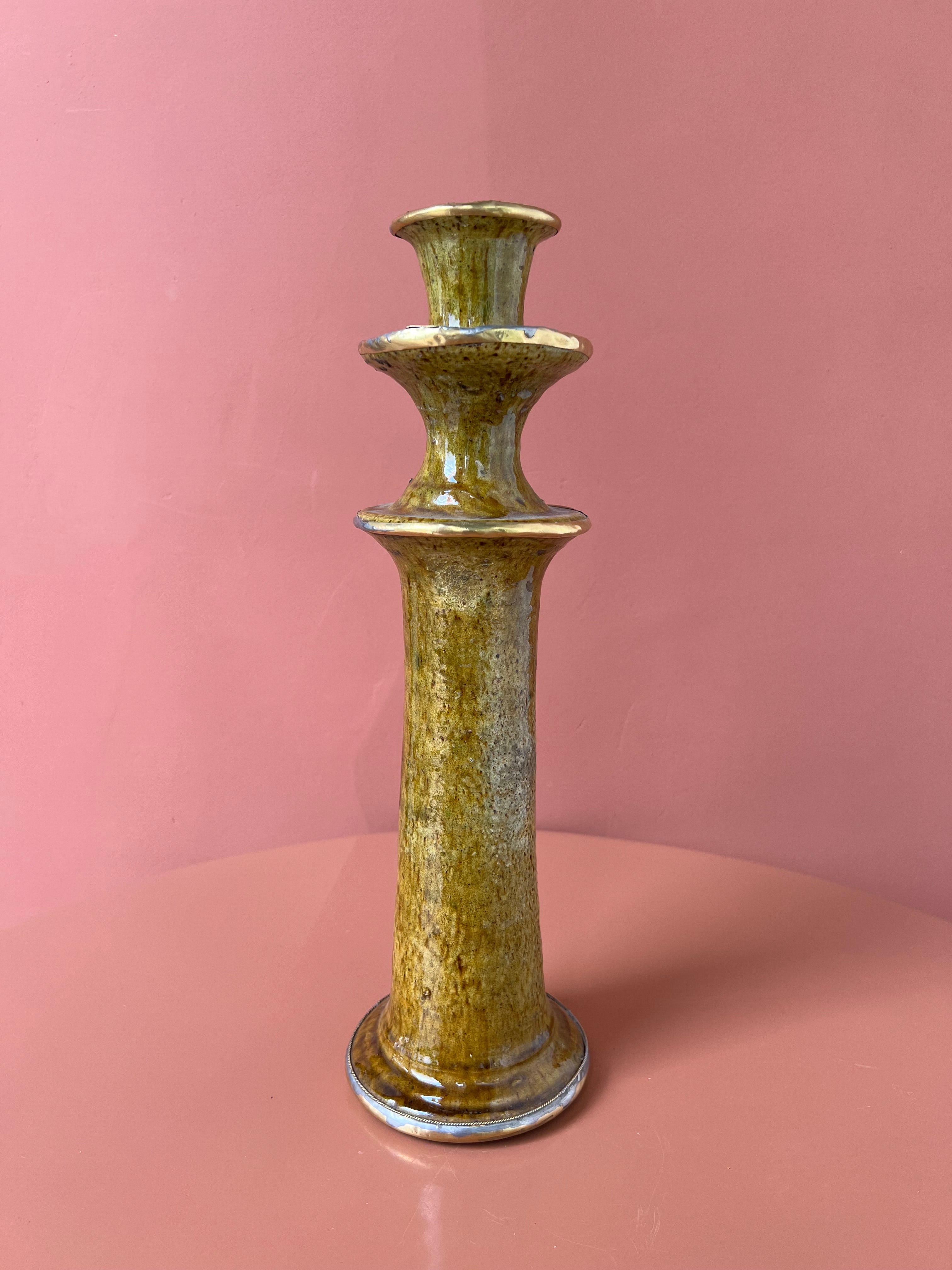 Prachtige Tamegroute kandelaar in de kleur mosterd/oker geel. De kandelaar heeft messing details, waardoor deze extra speciaal is en een luxe uitstraling heeft.